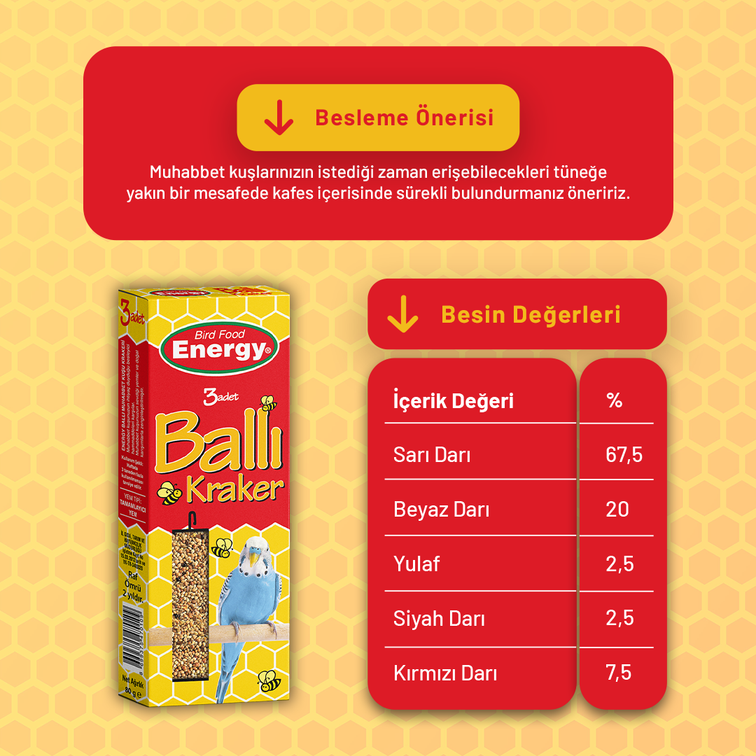 Energy Ballı Krakerlerinin içeriğinde darı, tahıllar, mineral, kalsiyum, fosfor, vitaminler konserve edici madde ve bal bulunmaktadır.